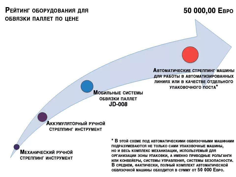 - Большая ценовая и технологическая ниша между ручным стреппинг инструментом, ручным или аккумуляторным, и автоматическими стреппинг машинами или автоматизированными комплексными упаковочными линиями. Фактически у потребителя был выбор использовать или ручной стреппинг инструмент, или вкладывать очень серьезные ресурсы в установку автоматизированных линий большой производительности с развитой системой механизации, что требует значительных финансовых затрат, выделение больших площадей для установки оборудования, существенное изменение внутрипроизводственной логистики, а также привлечение большого количества квалифицированного персонала для его использования и обслуживания.