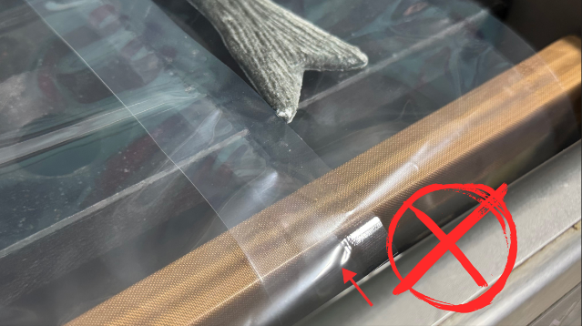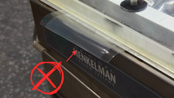 4. Размещать пакет на запаечной планке неровно, со сдвигом по диагонали. При таком размещении пакет качественно не запаяется, поэтому важно расположить пакет ровно на планке запайки, расправив края, чтобы шов располагался параллельно планке вакуумного упаковщика.