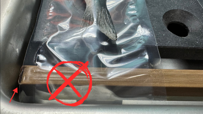 3. Располагать пакет ниже или выше уровня запаечной планки. Для создания ровного и герметичного шва при упаковке продукт должен лежать в камере на одном уровне с запаечной планкой. Не ниже и не выше. Для этого используются специальные вставки в камеру вакуумного упаковщика, чтобы продукт лежал ровно. Это позволит сделать качественный герметичный шов.