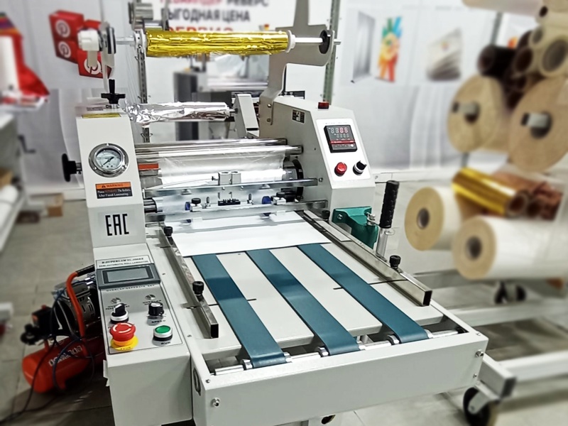 Профессиональный полуавтоматический ламинатор R-SUPERLAM SL-400BR для горячего ламинирования цифровых и офсетных тиражей установлен в демозале ГК «РУССКОМ».