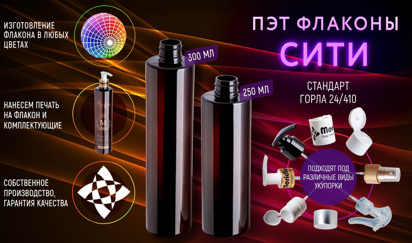 Компания «Меридиан» представляет серию ПЭТ флаконов Сити на и Они прекрасно подходят для косметических средств. В них можно фасовать жидкое мыло, гели и лосьоны. У флаконов идет стандартное горло , благодаря чему, его можно комплектовать с разными видами насадок: резьбовыми крышками, косметическими диск-топами, флип-топами, дозаторами для жидкого мыла и распылителями.