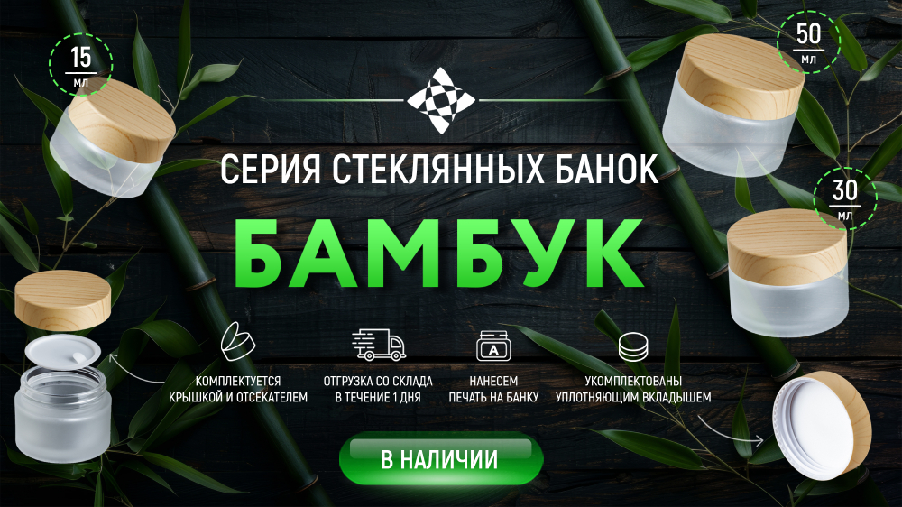 В наличии стеклянные банки Бамбук: 15 мл, 30 мл и 50 мл.