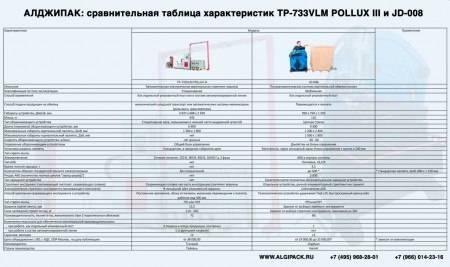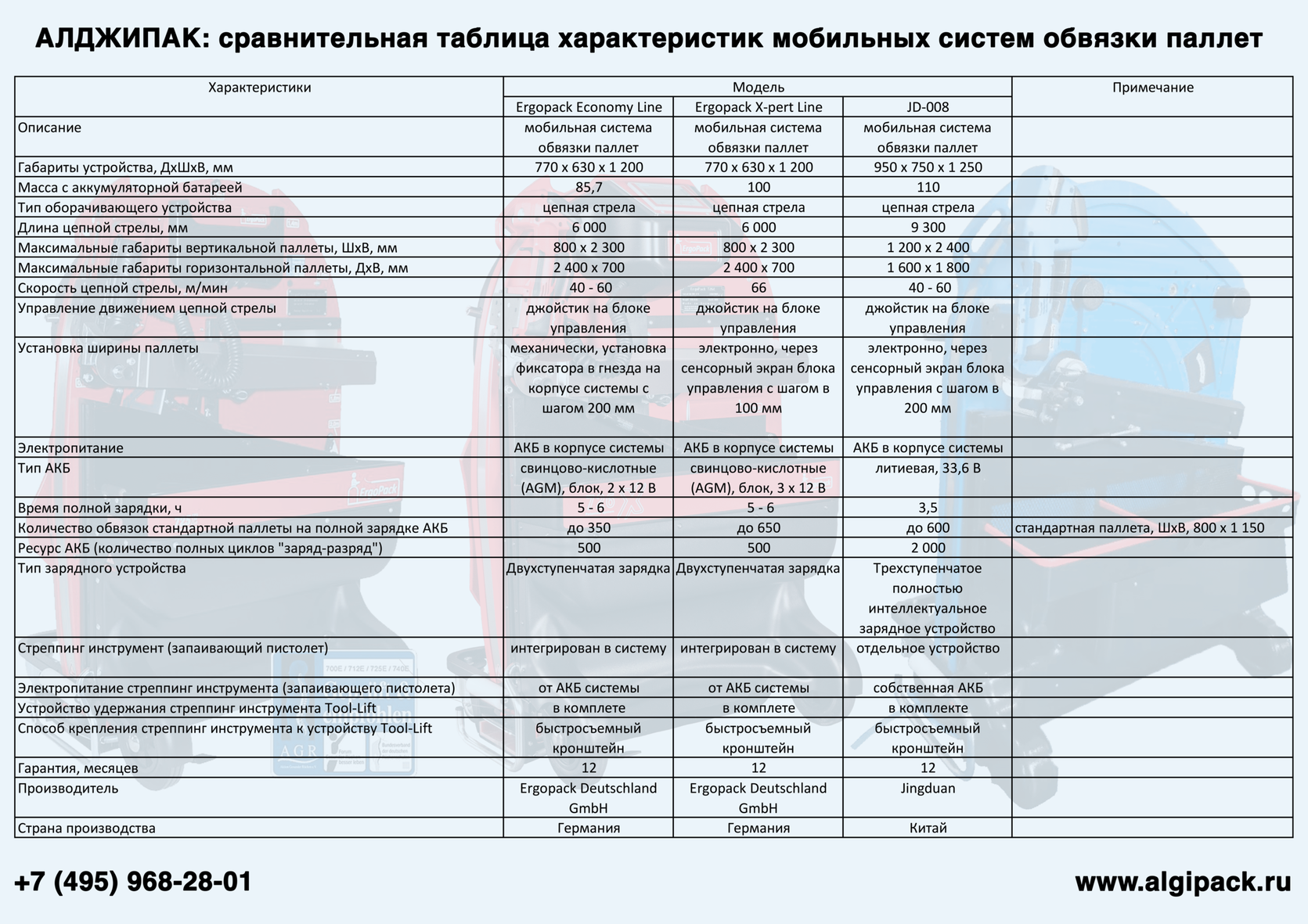 Вернемся к основной теме нашей публикации, а именно, к сравнению подходов к автоматизации процесса обвязки. Частично, пищу для размышлений и сравнений мы уже дали в тексте этой статьи. Ниже мы аккумулируем аргументы для сравнения подходов к организации процесса в общей таблице. Сравнивать мы будем только критерии выбора между полуавтоматическим и автоматическим оборудованием, причем за основу сравнения мы возьмем параметры и возможности двух моделей оборудования для вертикальной обвязки паллет, а именно, мобильной полуавтоматической стреппинг системы JD-008 и бюджетной автоматической стационарной стреппинг машины TP-733VLM POLLUX III.