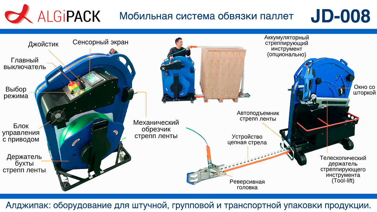 Подробную информацию о мобильных системах обвязки паллет и способах их применения Вы найдете на сайте компании АЛДЖИПАК.