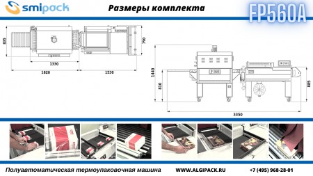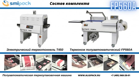 Полуавтоматическая термоупаковочная машина SMIPACK FP560A представляет собой комплект, состоящий из двух отдельных устройств – полуавтоматического термоножа FP560A и электрического однокамерного термотоннеля T450. Устройства представляют собой отдельные и независимые друг от друга машины, выполняющие собственные функции в процессе упаковки продукции.