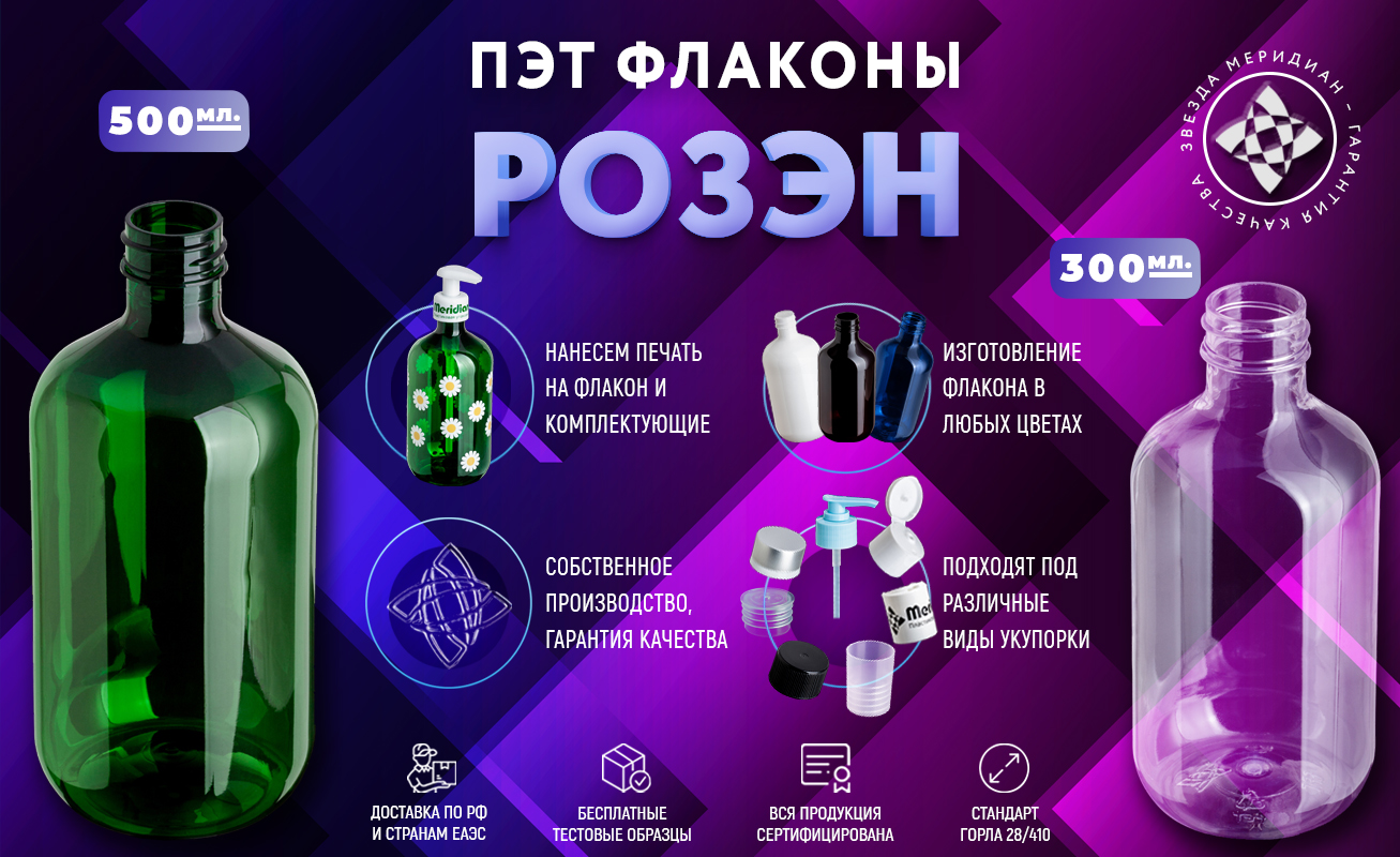 Серия ПЭТ флаконов "Розэн" 300 мл и 500 мл от компании "Меридиан"