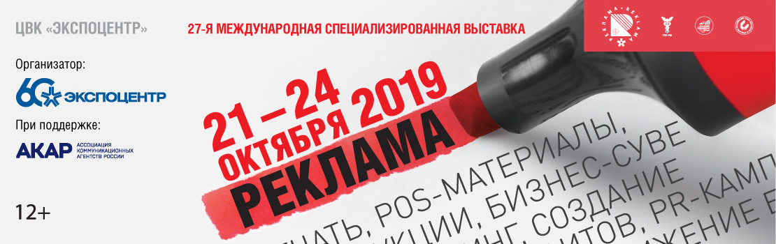 С 21 по 24 октября в павильоне 2 ЦВК «Экспоцентр» состоится 27-я международная специализированная выставка «РЕКЛАМА – 2019».