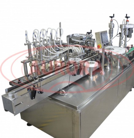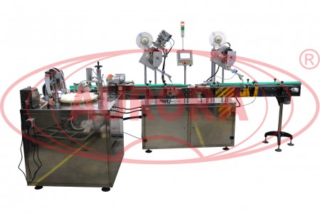 Моноблок оснащен перистальтическим насосом-дозатором с двумя соплами, забивщиком пробок, поворотным столом и пневмоцилиндром. Достоинством дозирующего узла машины является наличие гидрокомпенсатора, который позволяет избежать излишней пульсации при розливе. Благодаря этому достигается высокая точность дозы и отсутствие брызгов при подаче продукта. За счет оптических датчиков наличия тары работа всех узлов синхронизирована. Этикетировочная линия включает зоны позиционирования тары, нанесения этикеток на фронтальную и заднюю сторону, переворота тары и разглаживания лейблов прижимными щетками.