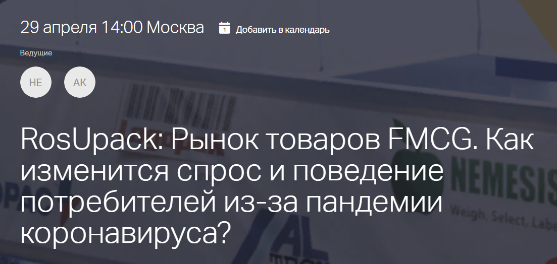 Первый вебинар «Рынок товаров FMCG. Как изменится спрос и поведение потребителей из-за пандемии коронавируса?» состоится 29 апреля 2020 года. Начало вебинара в 14.00 (время московское).