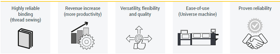 Новая книжная швейная машина оказалась именно тем решением, которое способно справиться с возложенной задачей. Универсальность использования, надежность и высокая производительность (500 листов/мин при постоянной скорости подачи) стали решающим фактором при выборе.
