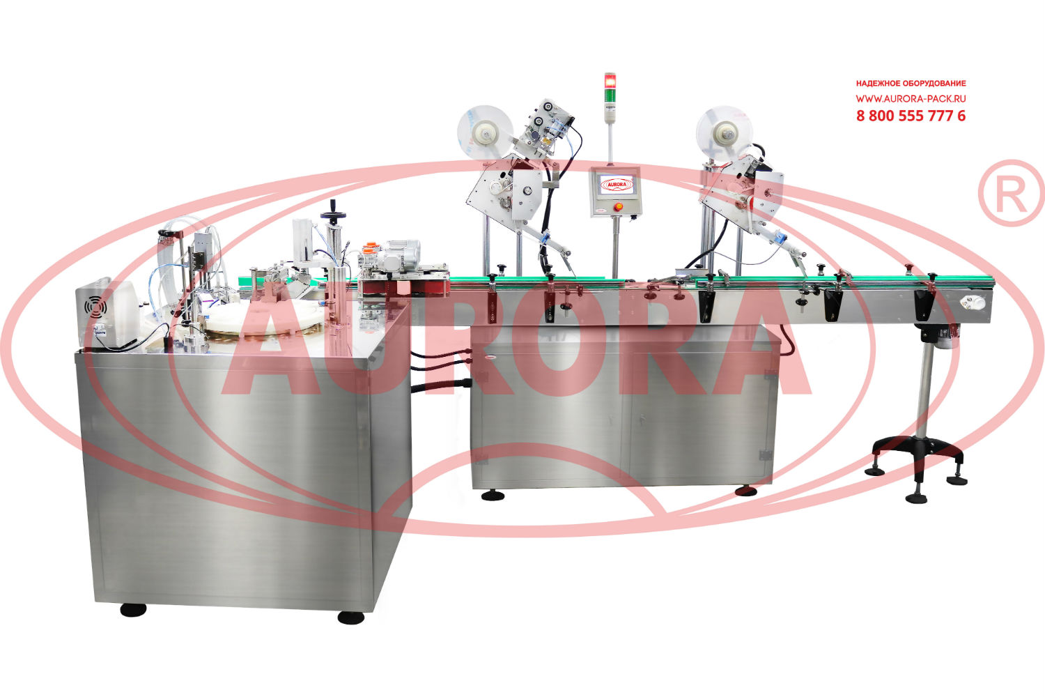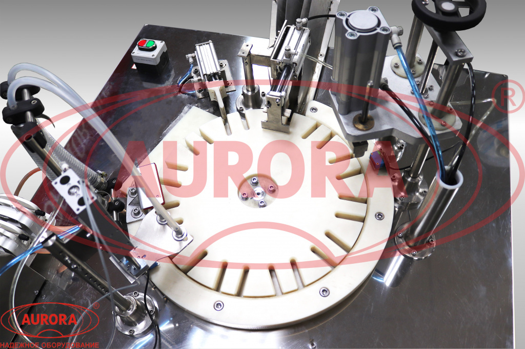 Дозирование продукта реализуется одновременно в две единицы тары посредством перистальтического насоса-дозатора. На компактном экране touch screen оператор может в несколько касаний произвести калибровку и выставить все необходимые параметры работы. Укупорочный узел представляет собой однопозиционную станцию с механизмом деликатной забивки. Эффективным решением для достижения экономии пространства, обеспечения пошаговой работы узла и бережного перемещения тары между механизмами стало оснащение машины поворотным столом с отверстиями для тары. Моноблок имеет полуавтоматический принцип работы. Ручные действия обслуживающего персонала минимизированы и сводятся лишь к подаче тары и колпачков на участок. После укупорки флаконы перемещаются на конвейер этикетировщика.