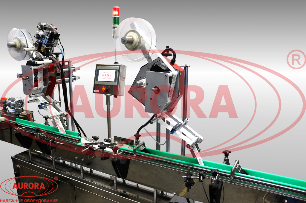 Зона лейблинга представлена автоматической линейной установкой с пластинчатым транспортером. Модуль имеет две станции аппликации для поочередного нанесения фронтальной и задней этикетки на плоские поверхности флаконов. На входе в узел расположена зона выравнивания, где положение тары корректируется для последующего ровного этикетирования. Оригинальным оснащением линии является наличие устройства переворота тары, которое выполняет ее переворот с лицевой на обратную сторону. Встроенный датировщик проставляет на этикетке дату и другие переменные сведения о продукте. Участок имеет собственную панель управления, выполненную на базе PLC.