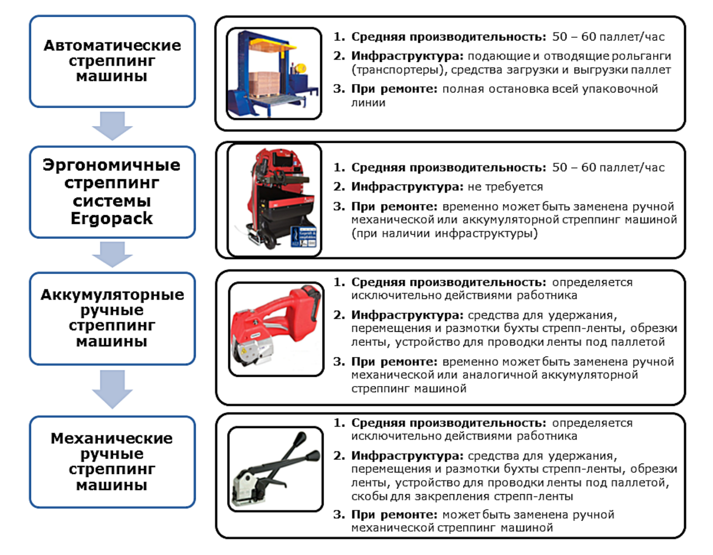 Предоставьте вашим сотрудникам новые возможности и увеличьте эффективность вашего производства с помощью современных стреппинг систем ErgoPack! С их использованием работа заиграет новыми красками. Ежедневное ручное стреппирование паллет занимает много времени, требует большого штата сотрудников, приводит к проблемам спины и, как следствие, вынуждает работодателя нести дополнительные материальные расходы на выплаты по больничным листам. Благодаря системе ErgoPack вы останетесь «в плюсе», с какой стороны ни посмотреть.
