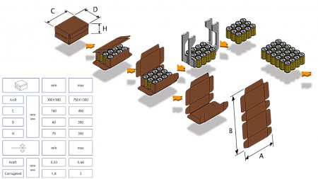 - Загрузка продукции в открытую U-образную картонную коробку посредством двойного движения приводных толкателей по 2 осям декартовой системы координат, управляемых четырьмя серводвигателями