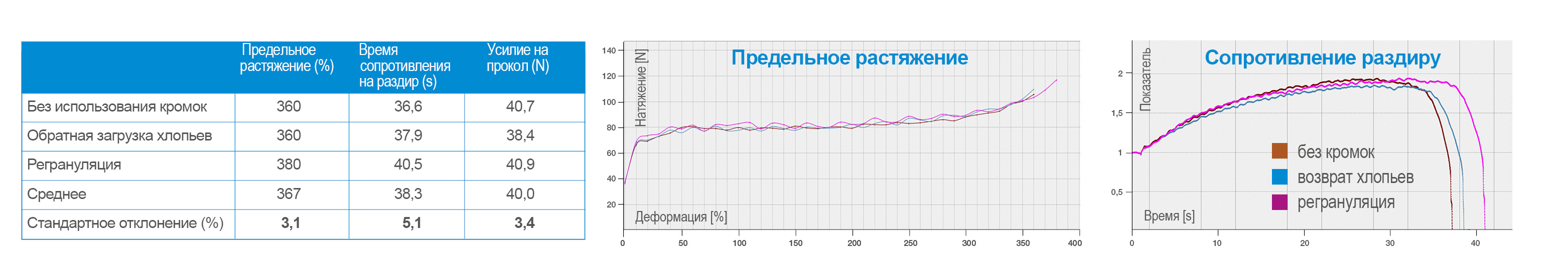 Каждые шесть часов выбирались образцы, измерялись и анализировались, с основным упором на три важных параметра: “предельное растяжение”, “прочность на прокол” и “сопротивление раздиру”. «Важно отметить, что все тесты мы проводим при 100% равных условиях, особенно в том, что касается фильтрации расплава. Ранее, при использовании хлопьев или регранулята в процессе, часто было необходимо увеличивать величину mesh размера ячейки при фильтрации расплава. На нашей линии SmartCast® Infinity во время всех тестов мы использовали только фильтры на 100 mesh, это достаточно низкое значение для данной области экструзии, но очень значимый аспект с учетом того, каких результатов в итоге нам удалось достичь»,– объясняет Томас Раушер, руководитель направления SML.