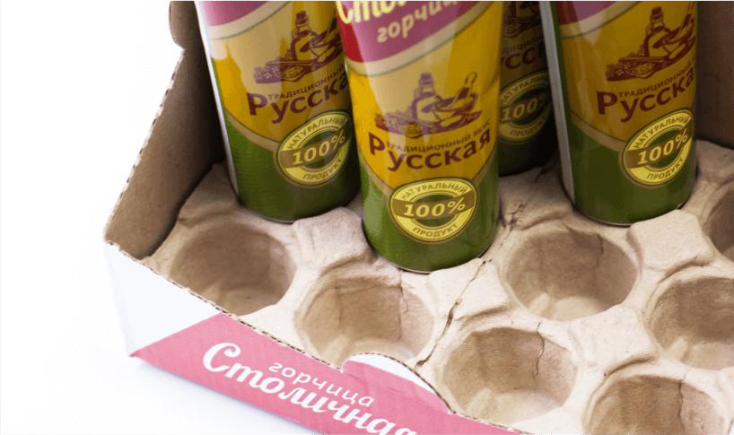 Коробка SRP (Shelf Ready Packaging) разработана для перевозки и продажи 12 туб с горчицей. Изготовленный из прочного микрогофрокартона, короб дополнен ложементом, удерживающим тубы на позициях и оберегающим их от повреждений во время транспортировки. Ложемент выполнен из пульперкартона – экологичного и легко перерабатываемого материала.