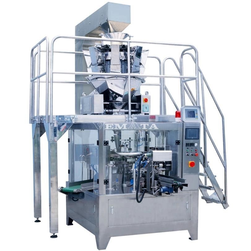 Компания «Вемата» поставляет такие линии в зависимости от конкретных потребностей заказчика – типа продукции, объёма производства, скорости работы, видов упаковки и т.д. Специалисты компании поставят весь комплекс оборудования, пустят его в эксплуатацию и обеспечат гарантийное и послегарантийное обслуживание. «Вемата» представляет один из вариантов такой линии – небольшой вертикальный фасовочно-упаковочный комплекс. Он состоит из ротационной упаковочной машины для готовых пакетов «дойпак», мультиголовочного дозатора, загрузочного элеватора и платформы для обслуживания.