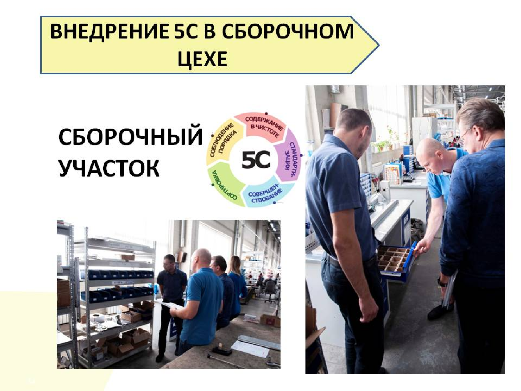 В сборочном цехе на участке сборки и упаковки так же внедрена система 5с: проведены тщательная уборка, сортировка и стандартизация размещения инвентаря и инструментов. Нанесена разметка, обновлены графики уборки, составлены схемы участка, подписаны стеллажи. Начальник сборочного цеха отметил лидеров изменений и поблагодарил за инициативу и вовлеченность сотрудников в общее дело.