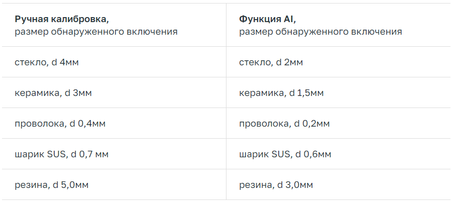 Результаты теста на производстве творожных сырков представлены в таблице: рентген-детектор работал в двух режимах – при стандартной калибровке и с функцией AI.
