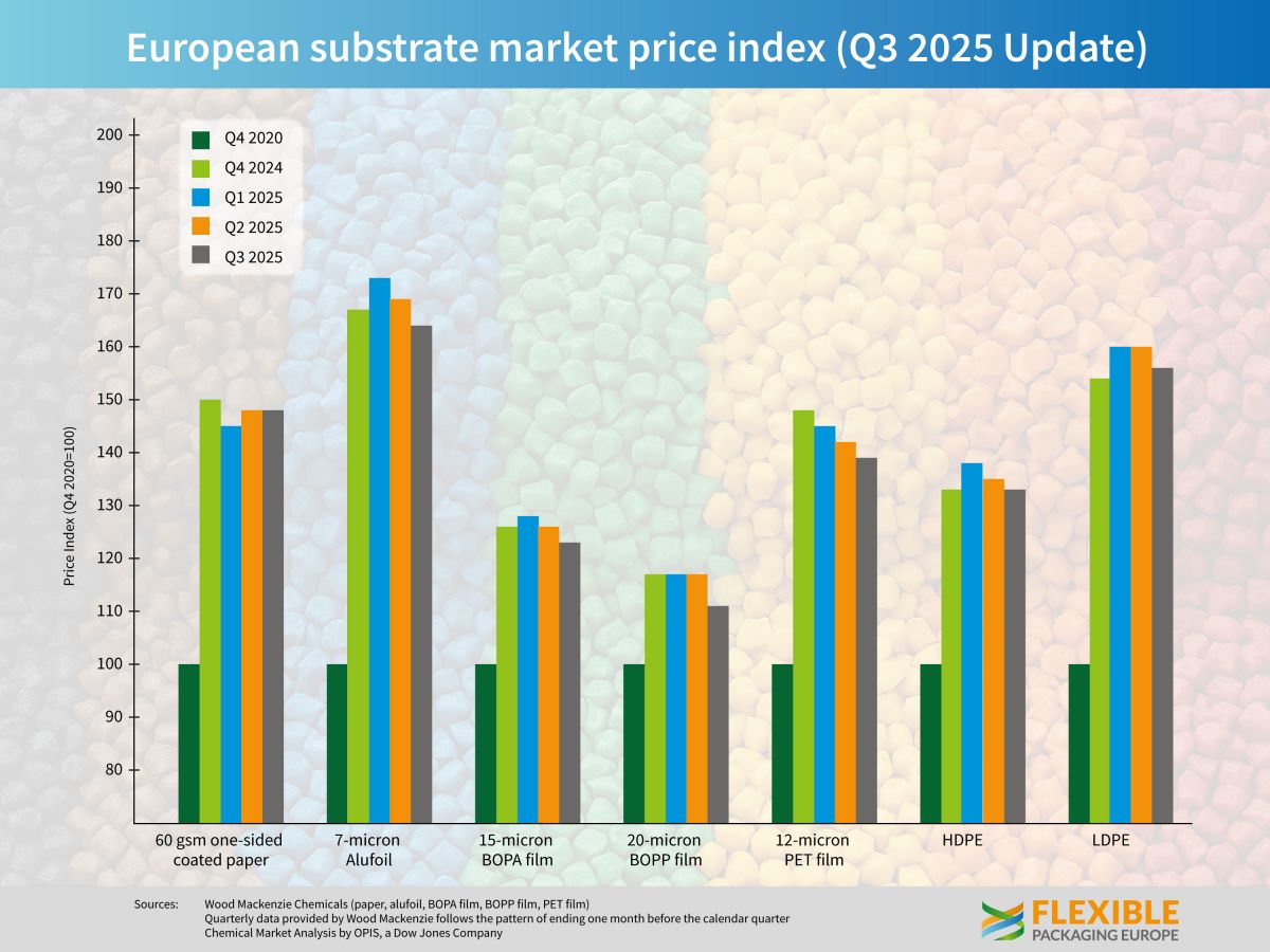 The markets for flexible packaging materials recorded some minor price decreases across the substrates in the third quarter of 2025. Aluminium foil (7 micron) showed particularly pronounced reductions, alongside BOPA, BOPP and BOPET films. While one-side coated paper (60 g/m²) remained stable, HDPE and LDPE continued the weaker trends seen during the first half of the year.