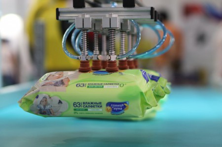 Робототехнический комплекс на базе робота M-20iA/35M блестяще продемонстрировал преимущества технического зрения, безошибочно определяя положение пачек с салфетками на ленточном конвейере. Робот брал поочередно пачки салфеток, формируя слой для последующей упаковки, и перемещал в картонную коробку, установленную на отводящем конвейере. Второй робот Fanuc, в свою очередь, возвращал продукцию в хаотичном порядке на подающий конвейер.