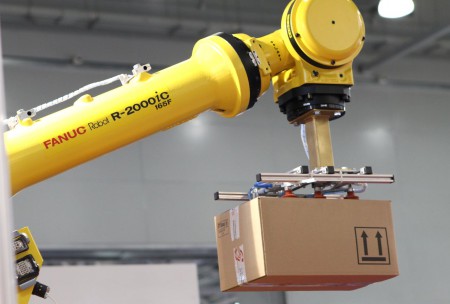 Посетители стенда Солан-Д увидели, как работает маневренный универсальный робот серии R2000iC/165F, который с постоянной точностью перекладывал коробки с одной паллеты на другую.