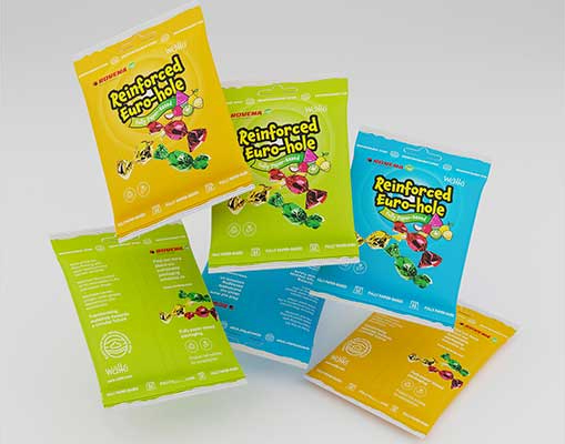 Sweets and confectionary are usually packed in small plastics pouches equipped with a euro hole to allow them to be hung up on metal hooks in supermarkets. Plastics film have been the material of choice to make sure the pouch withstand the weight of the sweets to avoid the risk of the euro holes being torn and the bags falling off the hooks.