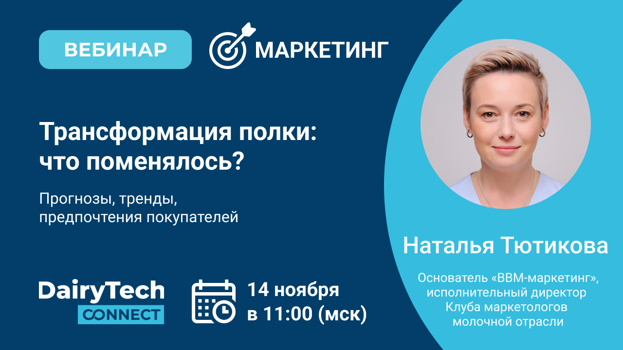 14 ноября в 11:00 состоится онлайн-встреча «Трансформация полки: что поменялось?», на которой выступит Наталья Тютикова, основатель ресурса ВВМ-маркетинг, исполнительный директор «Клуба маркетологов молочной отрасли».