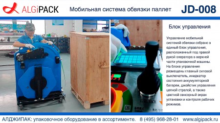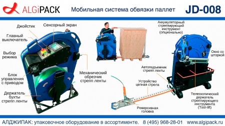 Модель JD-008 представляет собой комплект узлов и инструментов, собранных в едином корпусе на силовой подвижной раме, и обеспечивающих процесс вертикальной обвязки полимерной стрепп лентой грузов на. Работу с системой осуществляет один оператор. Система включает в себя: