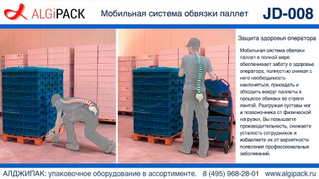 Основной причиной создания мобильных систем обвязки паллет стало необходимость оптимизировать работу работника и снизить объем физической нагрузки, которую он испытывает в процессе работы. При ручной обвязке паллет работнику приходится постоянно наклоняться, приседать и обходить вокруг паллеты, что при длительной работе негативно сказывается на состояние его здоровья. В зоне риска спина, поясница, колени, суставы голеностопа, а также локтевые суставы, постоянно подвергающиеся высокочастотным колебаниям, генерируемыми при работе ручного аккумуляторного стреппинг инструмента. Конструкция системы обвязки JD-008 полностью избавляет оператора от нагрузок и снижает практически до нуля риски получения профессиональных заболеваний.