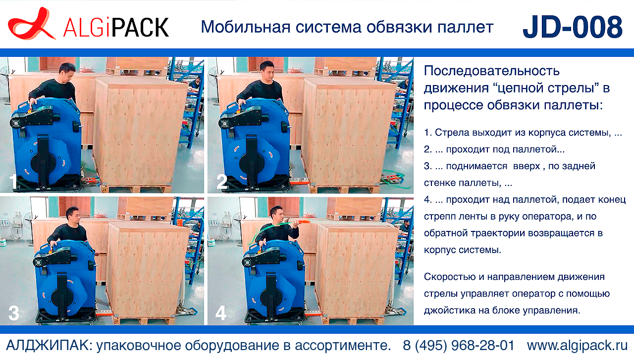 Конструкция мобильной системы обвязки паллет JD-008 обеспечивает следующие функциональные возможности: