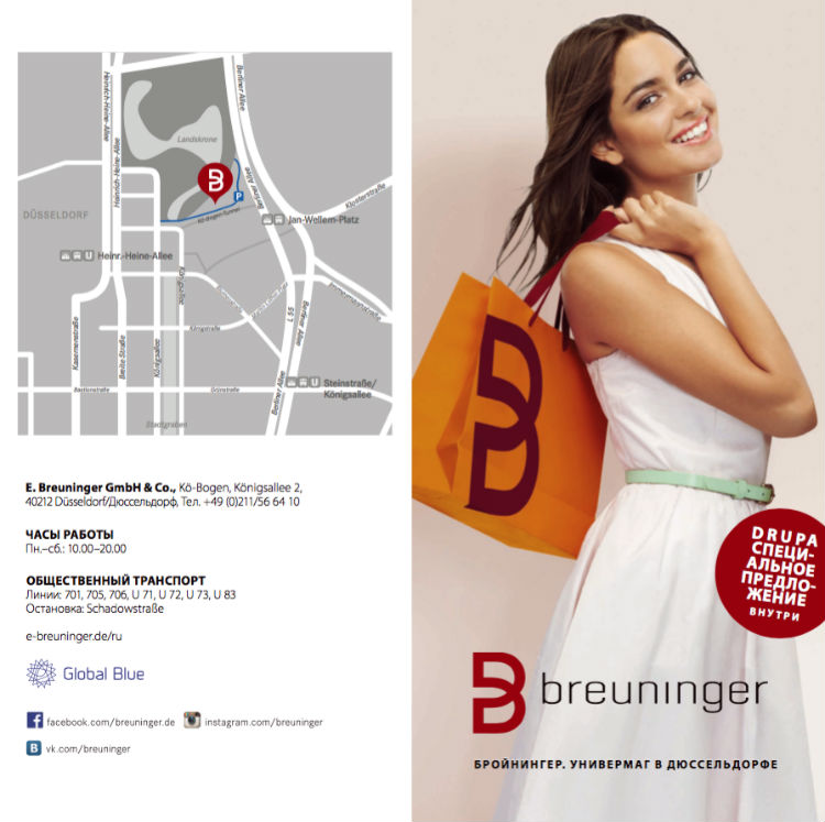 Известный торговый центр Breuninger, находящийся в самом сердце Дюссельдорфа на Кёнигсаллее, дарит 10%-ю скидку только для участников и посетителей выставки drupa 2016.