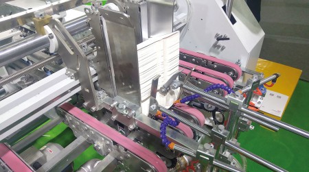 Эта линия половинного формата предназначена для сборки коробок с шеститочечной склейкой и возможностью загибки задних клапанов. Такие возможности позволяют применять ее для выпуска сложной упаковки, например, для кондитерских изделий. Также стоит отметить появления ряда технических усовершенствований, упрощающих и ускоряющих переналадку линии.