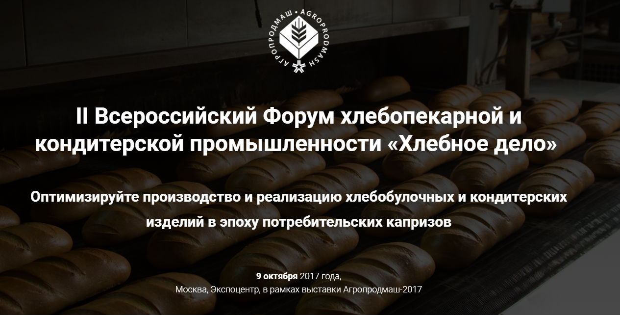 9 октября 2017 года в рамках деловой программы выставки «Агропродмаш 2017» пройдет Всероссийский Форум хлебопекарной и кондитерской промышленности «Хлебное дело», организованный КВК «ИМПЕРИЯ».