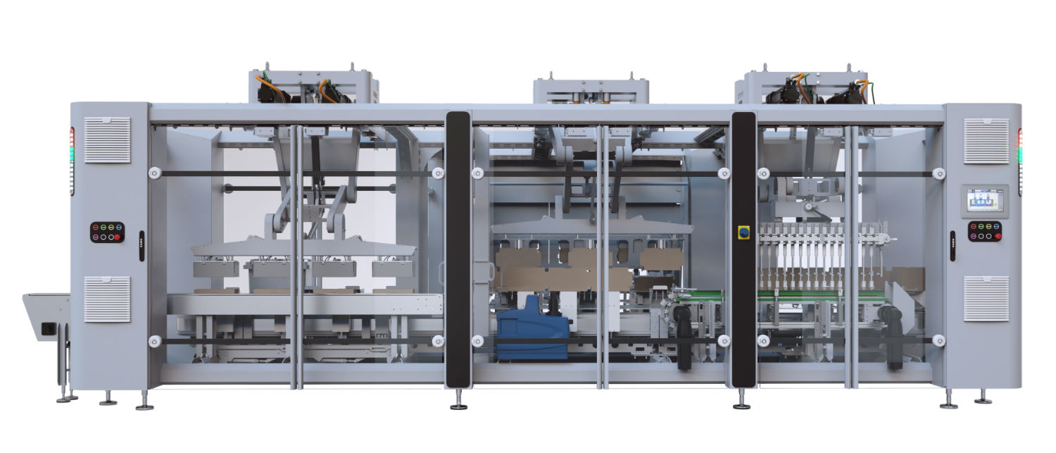В секции формования робот берет плоские заготовки в контейнере и формирует картонные коробки, которые затем переносятся механизмом для перемещения в буферную зону, где они находятся (в нужном количестве), прежде чем их перенесут в зону загрузки. Система загрузки транспортера с многочисленными карманами переносит продукты, которые второй робот отбирает и загружает в картонные коробки в нужной конфигурации. Пройдя через следующую буферную зону, заполненные коробки, наконец, закрываются (в заданном количестве) в зоне закрытия и окончательно заклеиваются.
