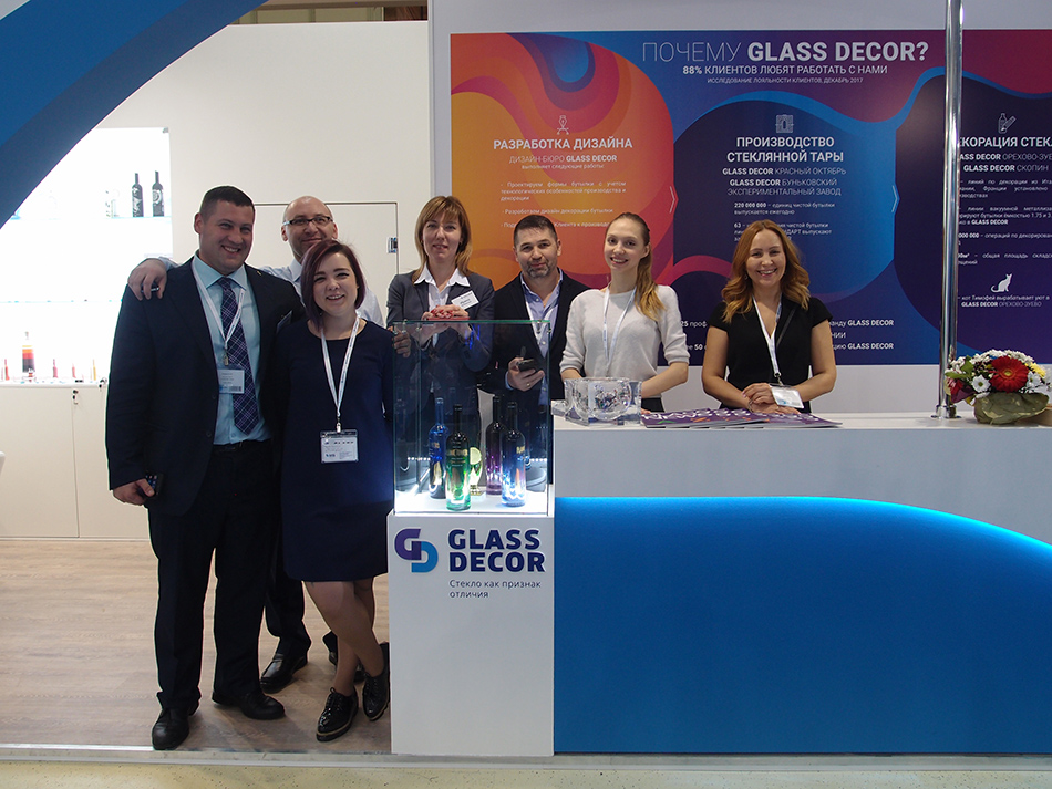 Компания Glass Decor представила на крупнейшей национальной выставке продуктов питания и технологий «Продэкспо-2018» ассортимент декорированной и чистой бутылки в линейках «Элит» и «Стандарт».