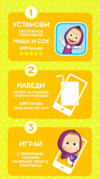 Для маркетинга «дополненная реальность» значит также: глубокое вовлечение потребителей в коммуникацию с брендом, более объемное восприятие и дополнительные эмоции. Эта технология создает целые миры отдельных марок, которые после загрузки в цифровом виде будут интерактивно взаимодействовать с пользователем - чтобы поиграть с любимыми героями с пачки сока «Маша и медведь» 500 мл, родителям достаточно скачать бесплатное приложение ARFriendly, навести камеру на упаковку и герои сразу оживут на экране смартфона.