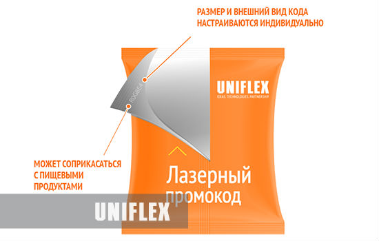Также “Унифлекс” наносит коды с помощью чернил. Такой код печатается на ПП и ПЭТФ-пленках, а также фольге. Длина кода – до 10 цифро-буквенных символов. Промокод, нанесенный чернилами, не должен напрямую соприкасаться с пищевыми продуктами, поэтому он “закрывается” дополнительным слоем пленки.