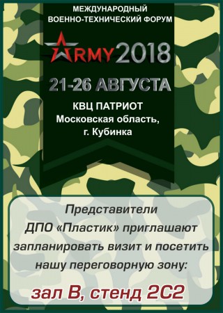 Компания ДПО Пластик приглашает посетить объединенный стенд Нижегородской области на военно-техническом форуме «АРМИЯ-2018». В этом году выставка пройдет в четвертый раз с 21 по 26 августа в городе Кубинка, расположенном в Подмосковье.