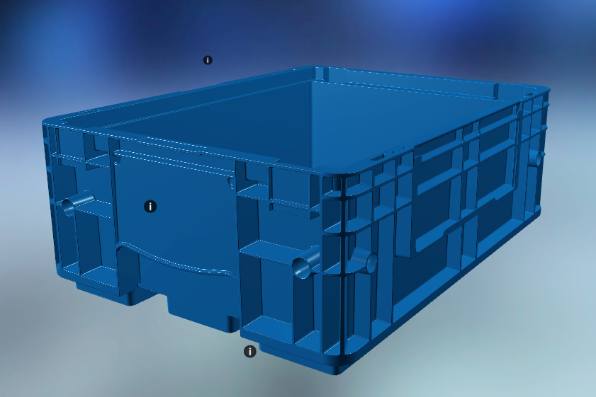 К примеру, тара R-KLT для автомобильной промышленности создавалась с учетом всех требований данной отрасли и согласно европейским стандартам VDA 4500. На 3D изображении (по ссылке) можно рассмотреть ребра жесткости, удобные ручки, дно контейнера и другие особенности ящика. Такие контейнеры выдерживают большие нагрузки благодаря частично усиленному дну, а также их можно штабелировать друг на друга.