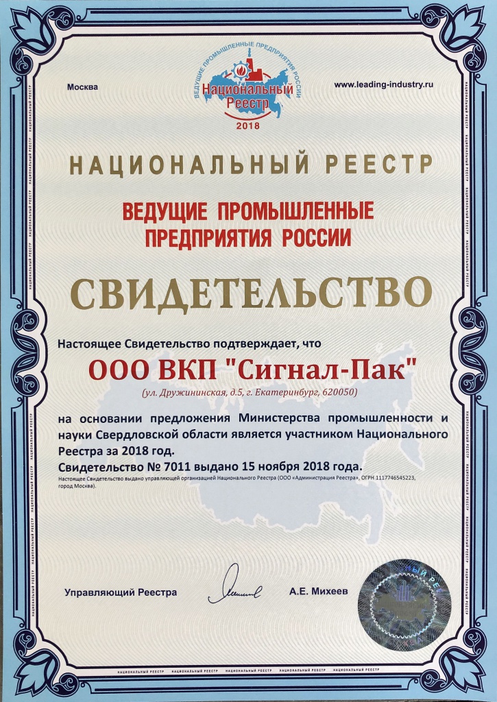 Компания "СИГНАЛ-ПАК" вошла в состав участников Национального Реестра ведущих промышленных предприятий России за 2018 год.