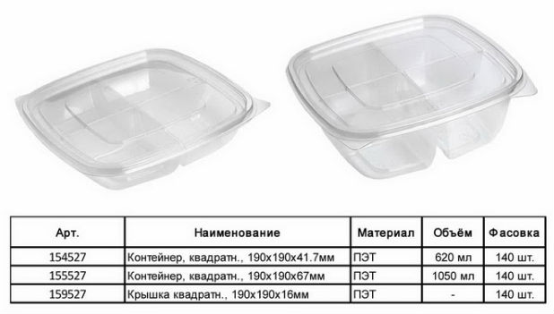 Прозрачные контейнеры с 4-ми секциями и герметичной крышкой позволяют представить покупателю любое ассорти: нарезанных фруктов, овощей, ягод, деликатесов, солений, варенья, джемов, десертов.