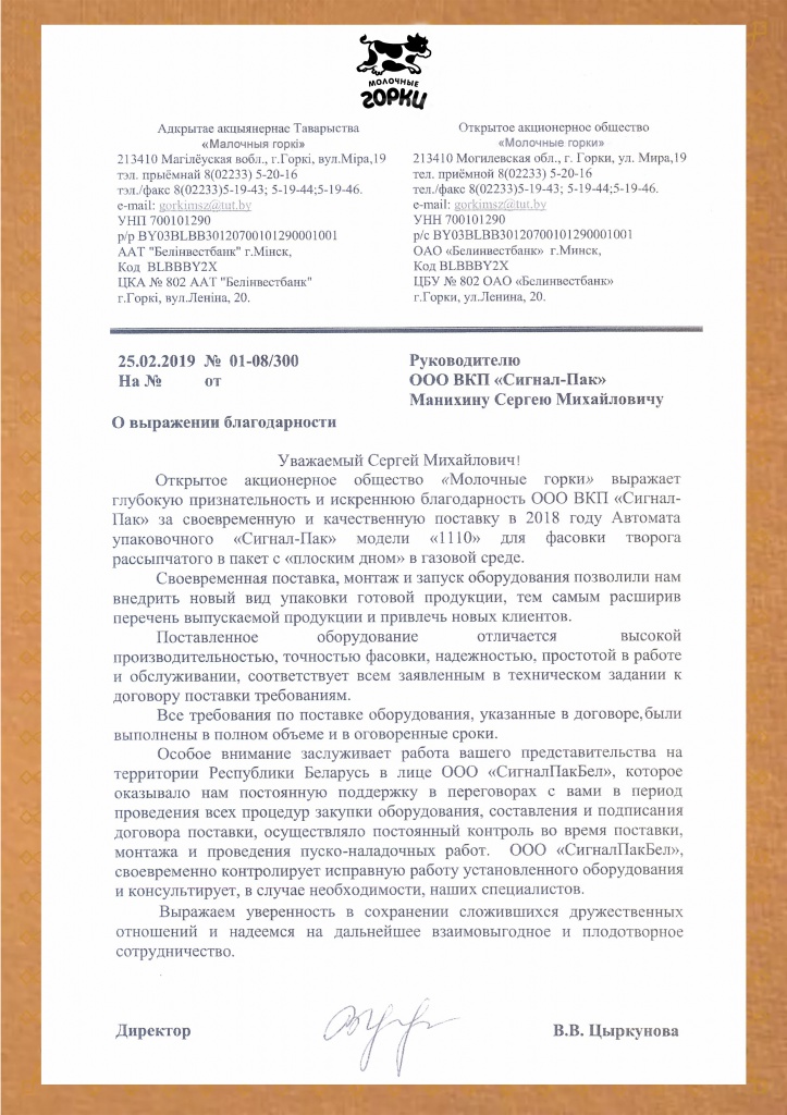 Одним из значимых проектов прошлого года в этом регионе стал проект для компании «Молочные горки», старейшего молокозавода Могилёвской области. Заказчиком была поставлена задача разработки и поставки линии для фасовки творога в пакет с плоским дном в газовой среде.