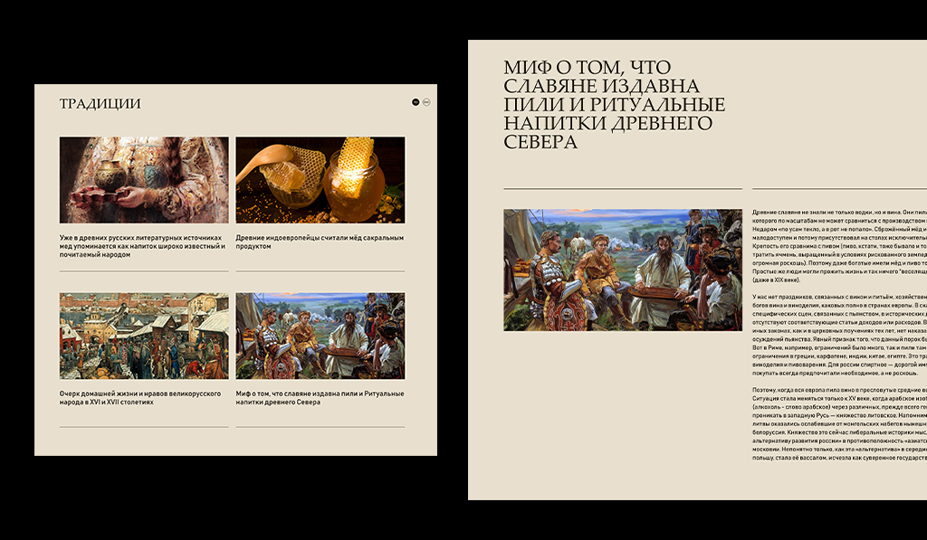 Поэтому информационные страницы сайта создают атмосферу старинных традиций, а вот дизайн продуктовых страниц выдержан в лаконичном минималистичном стиле, выделяя сам напиток и его особенности на передний план. Но и в карточках товаров переданы характерные черты славянского стиля - натуральность цветов и оттенков.