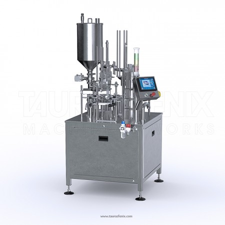 Автомат роторного типа , предназначенный для дозированной фасовки в пластиковую тару различных форм и размеров жидких и пастообразных продуктов с добавлением мягких, легко деформирующихся компонентов размером до 10 мм, с последующей запайкой фольгой и укупоркой пластиковой крышкой.