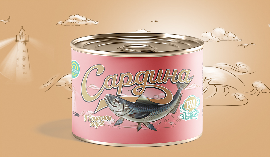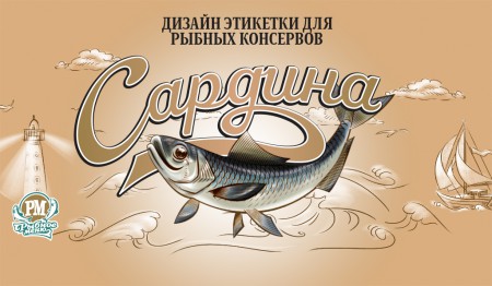 Передаче настроения ретро способствовали: уникальный, созданный вручную леттеринг слова «Сардина», воздушные иллюстрации фонового рисунка, детально отрисованная иллюстрация сардины. При отрисовке иллюстрации важно изучить реальную рыбу, ее строение, соотношение частей.