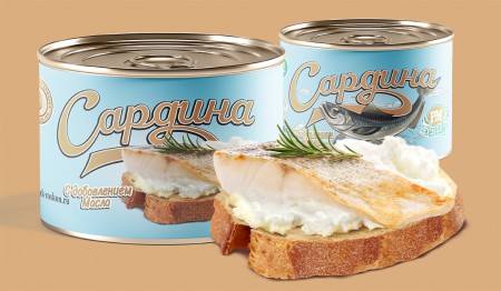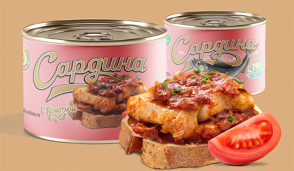 В категории рыбных консервов дизайны этикеток поделен на иллюстративные и фуд-зонированные. В новой этикетке для бренда Роскон совмещены два подхода: на одной стороне (фейсе) показана задающая настроение иллюстрация, на другой (бэке) манящая фуд зона с вариантом сервировки сардины.