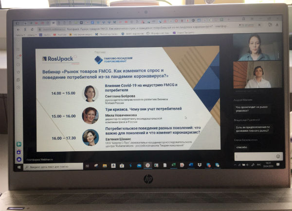 Вебинар стал первым мероприятием онлайн-курса RosUpack «Коронакризис: упаковка в новой реальности». В вебинаре приняли участие Светлана Боброва (Nielsen), Мила Новиченкова (Ipsos), Евгения Шамис (Sherpa S Pro). Партнером вебинара выступила компания «Павлово-Посадский Гофрокомбинат».