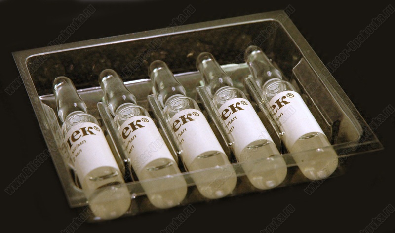 и пузырьков изготавливается из прозрачной жёсткой плёнки достаточной толщины. Такой блистер позволяет надёжно зафиксировать их защёлками. При извлечении блистера из картонной коробки они не выпадают, как это происходит с картонной упаковкой старого типа. Неиспользованные ампулы легко хранить в этой же упаковке.