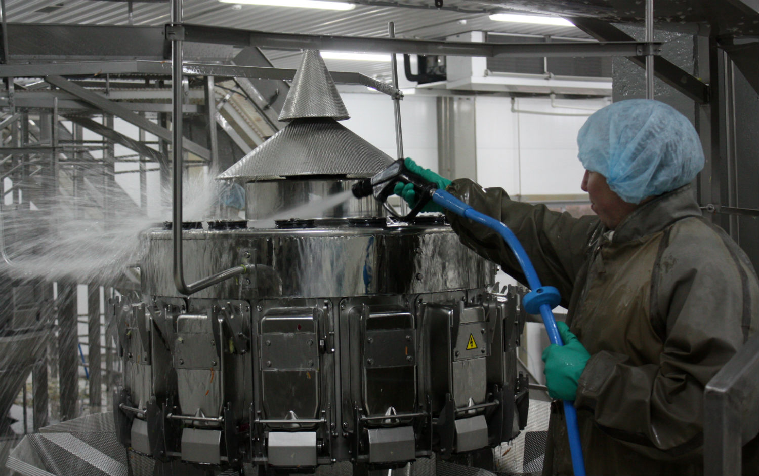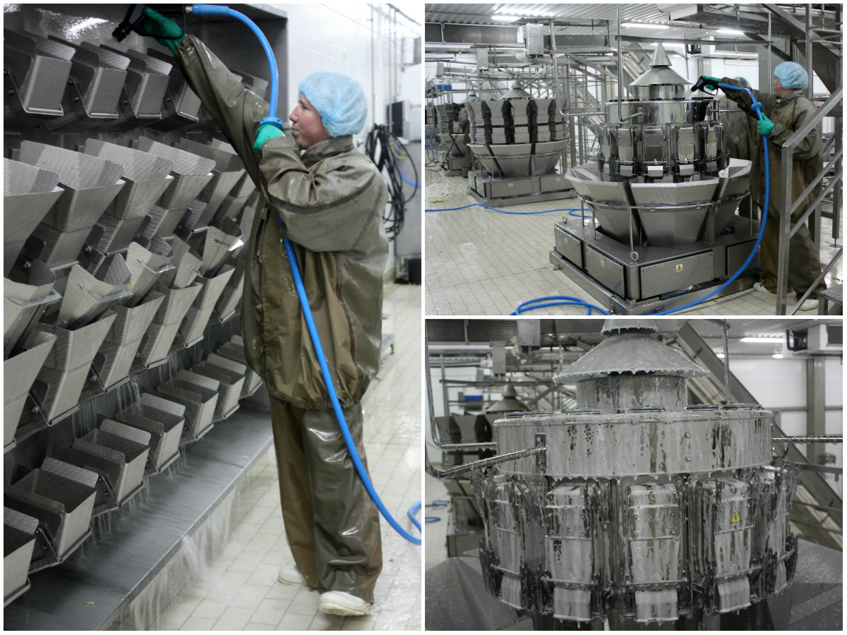Тем временем корпус весового дозатора обрабатывается специальной пеной и дезинфицирующим средством, чтобы удалить даже самые мелкие, невидимые невооруженному глазу частички продукции и убить все бактерии.